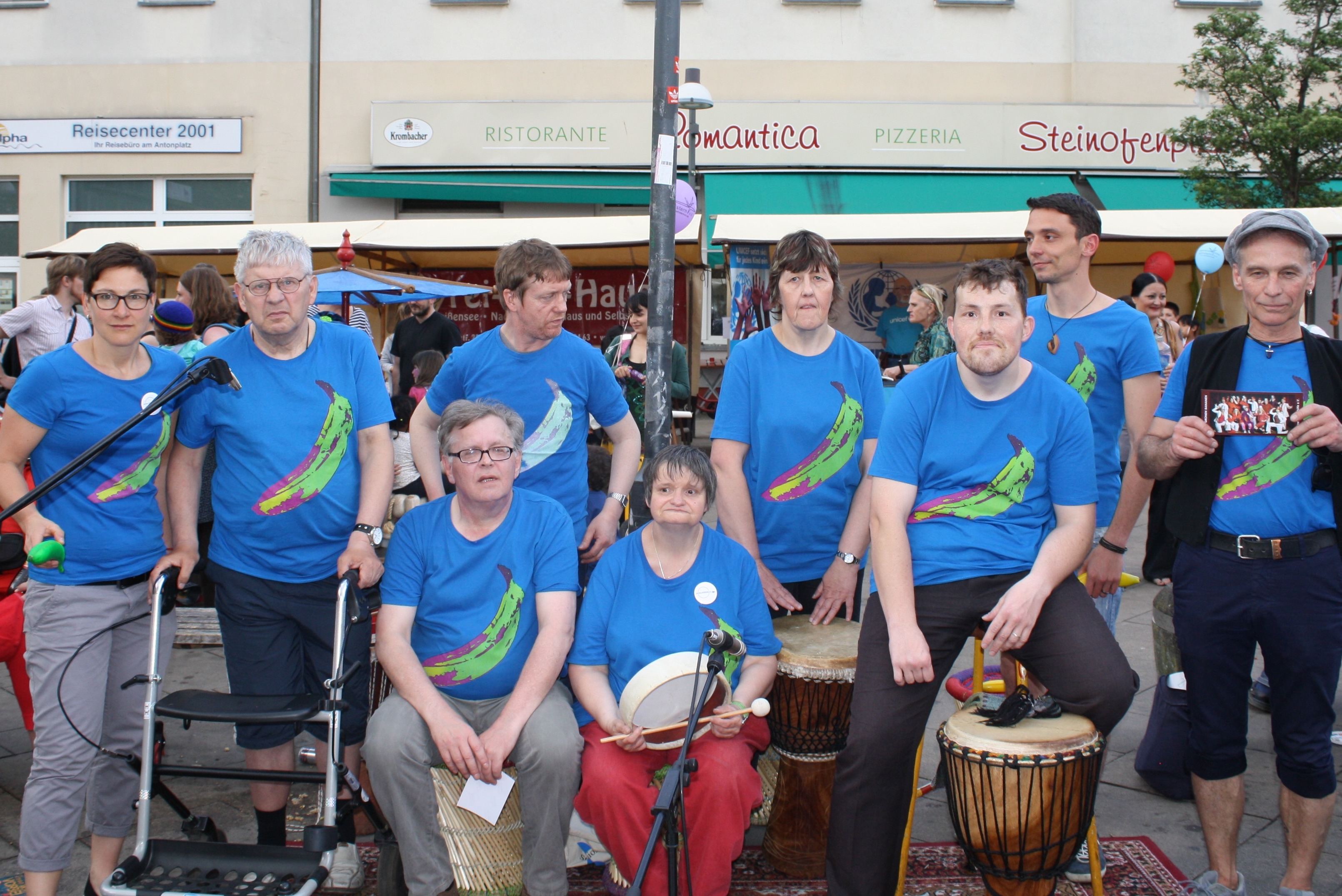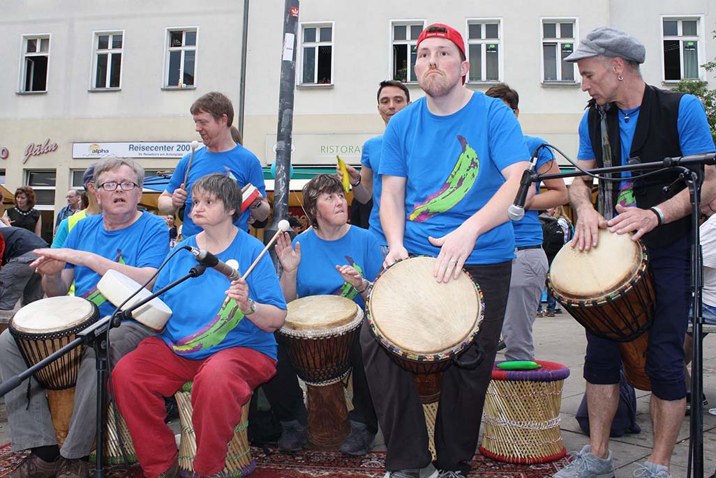 Die Grünen Bananen treten jedes Jahr als Trommelgruppe an verschiedenen Orten auf. Regelmäßig trommeln wir innerhalb des berliner STARThilfe e.V. bei Festen und Veranstaltungen der Standorte. Wir spielen aber auch auf Stadtteilfesten oder bei Fachveranstaltungen. Wir haben auf Wunsch sogar schon privat auf einer Geburtstagsfeier getrommelt.